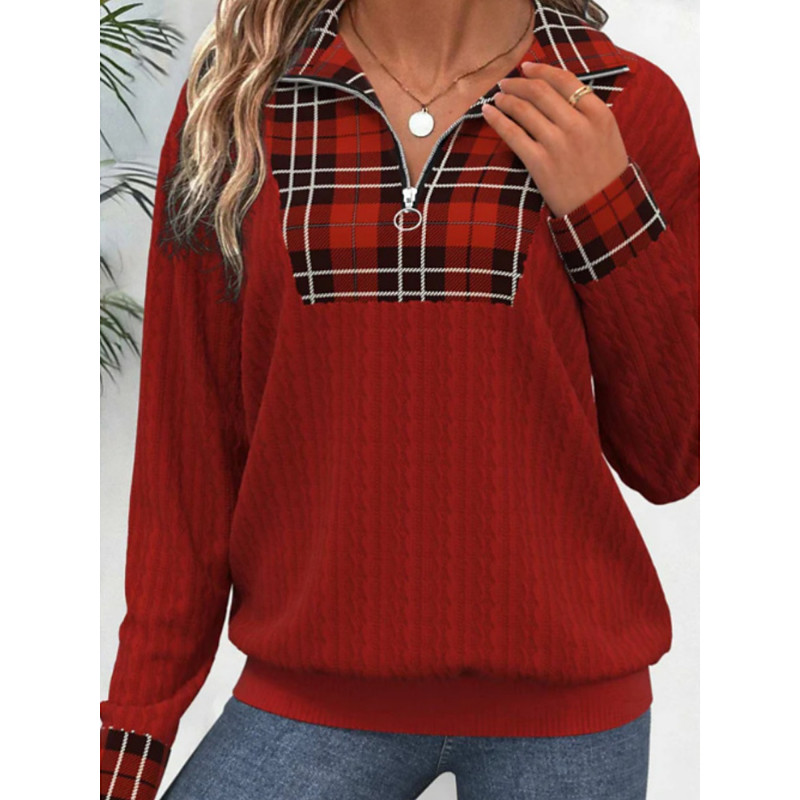 Women's Blouse Geometric Plaid Stylish Casual Long Sleeve V Neck Regular Tops Daily Zipper Print Red Blue Beige Gray Spring Fall Winter