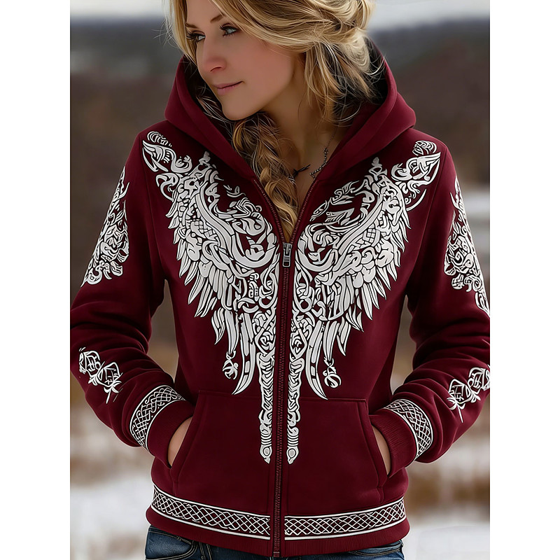Women's Zip Up Hoodies Graphic Geometric Fashion Western Casual Long Sleeve Hooded Regular Tops Casual Street Dailywear Zipper Pocket Print Black Wine Green Fall Winter