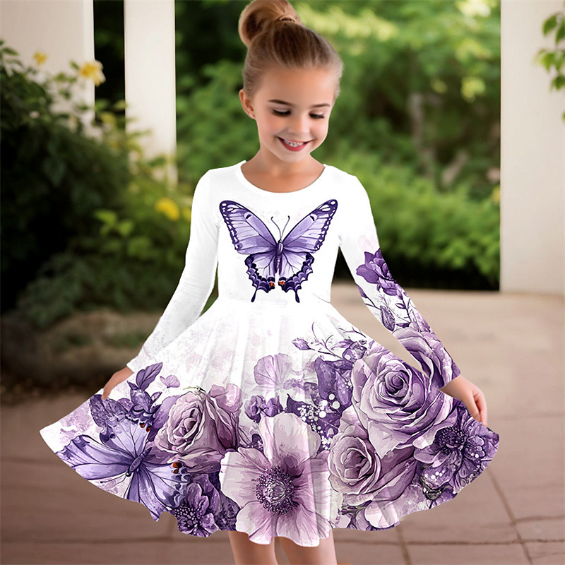Girls' 3D Butterfly Flower Dress Long Sleeve Summer Spring Vacation Daily Holiday Princess Beautiful Sweet Kids 4-12 Years Casual Dress A Line Dress Knee-length Regular Fit