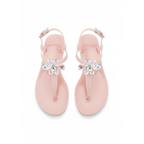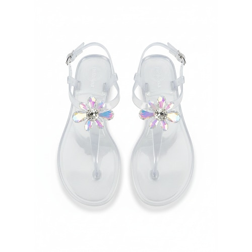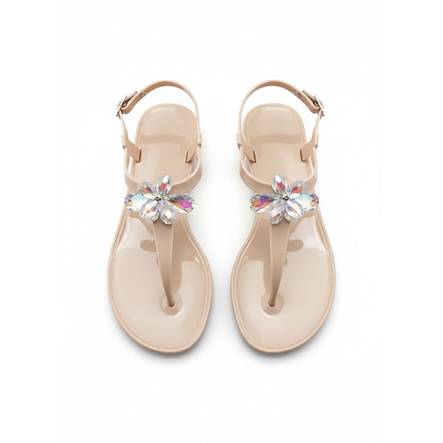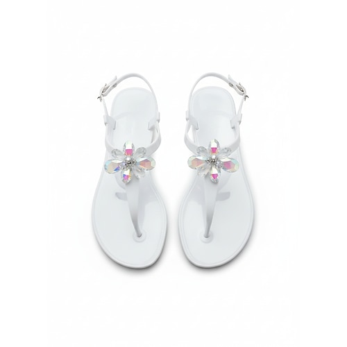 Elegante weiße Jelly-Sandalen für Damen – wasserfeste T-Riemen-Flip-Flops mit 3D-Blumenmuster Funkelnde Strassdekoration für Strandurlaube und Sommerhochzeiten Resort-Kleidung