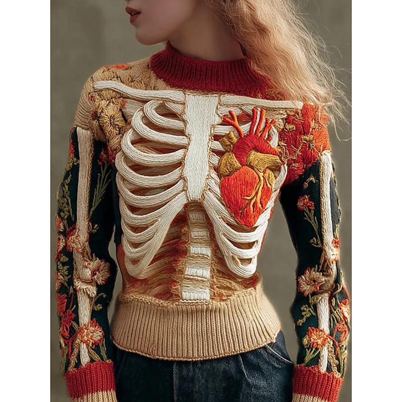 Women's Sweater Skeleton Cute Streetwear Casual Graphic Skeleton Crew Neck Patchwork Knitted Long Sleeve Regular Tops KnitRed Orange Fall Winter