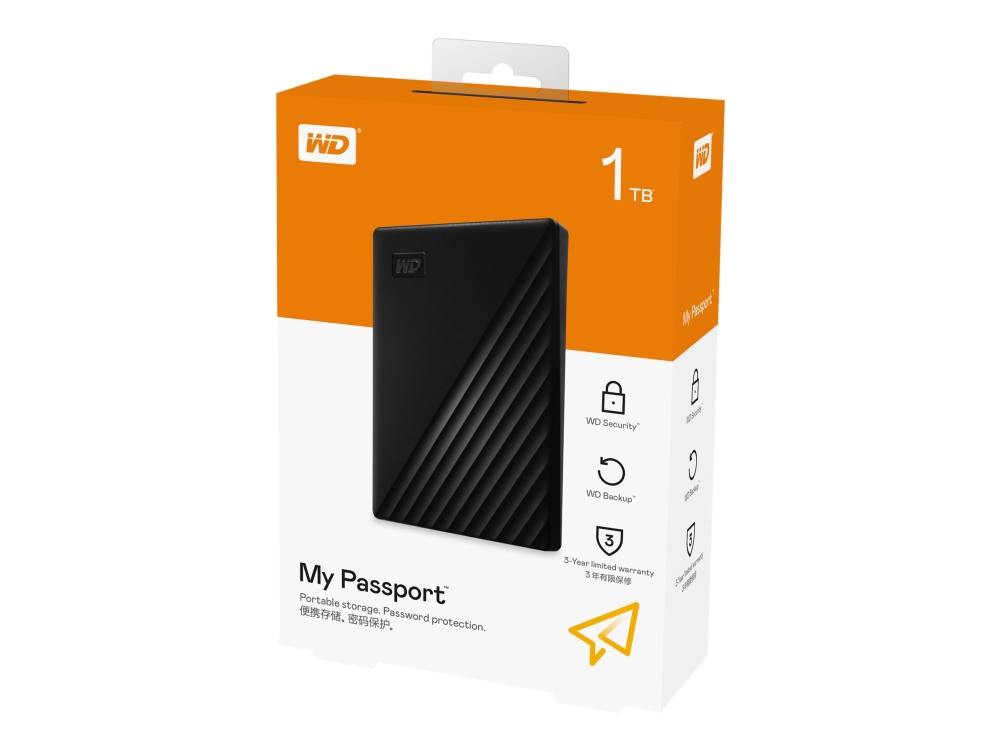 WD My Passport WDBYVG0010BBK – Festplatte – verschlüsselt – 1 TB – extern (tragbar) – USB 3.2 Gen 1 – 256-Bit AES – Schwarz