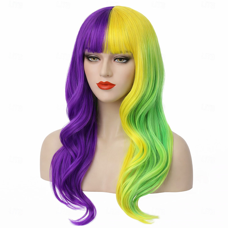 Carnival Wig Purple Green Yellow Wavy Long Synthetic Festival Wig Mardi Gras Parade Cosplay Costume Hair for Women