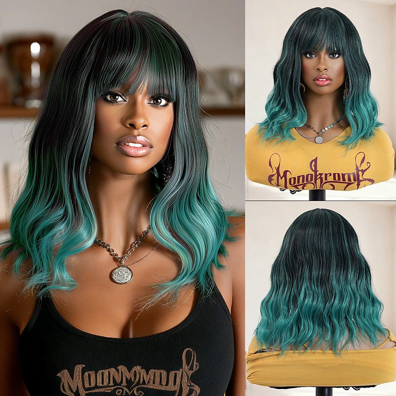 Long Dark Green Wig with Bangs Ombre Curly Green Wig for WomenLong Dark Green Cosplay Wig Synthetic Natural Looking for Daily and Party ChristmasPartyWigs St.Patrick's Day Wigs