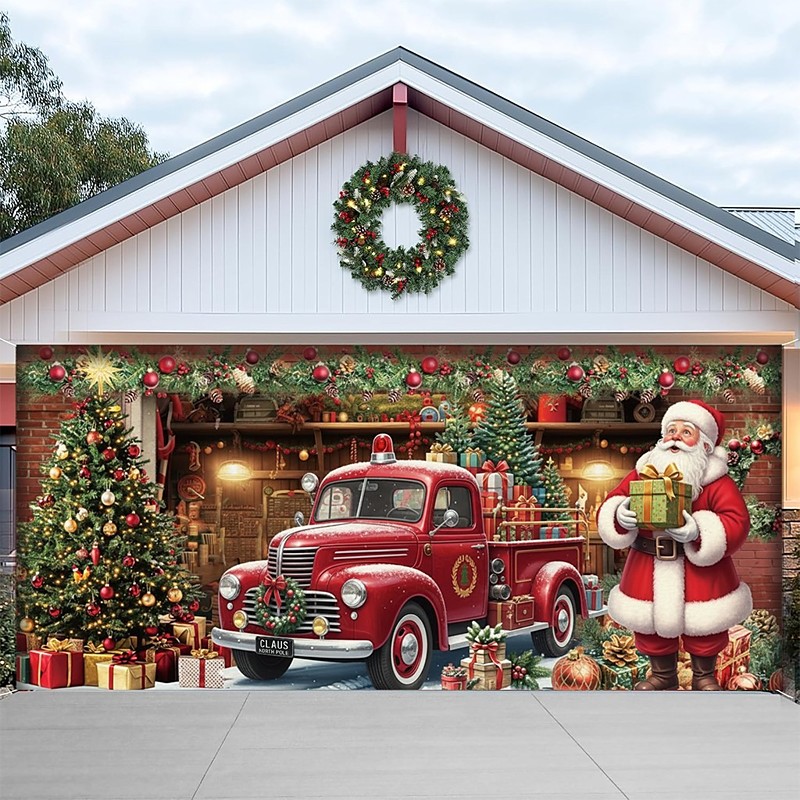 Christmas Garage Door Cover Santa Claus House Large Hanging Backdrop 2 Car Outdoor Holiday Party Decoration 2D flat print Festive Wall Banner Yard Home Christmas Scene Background 78 FT