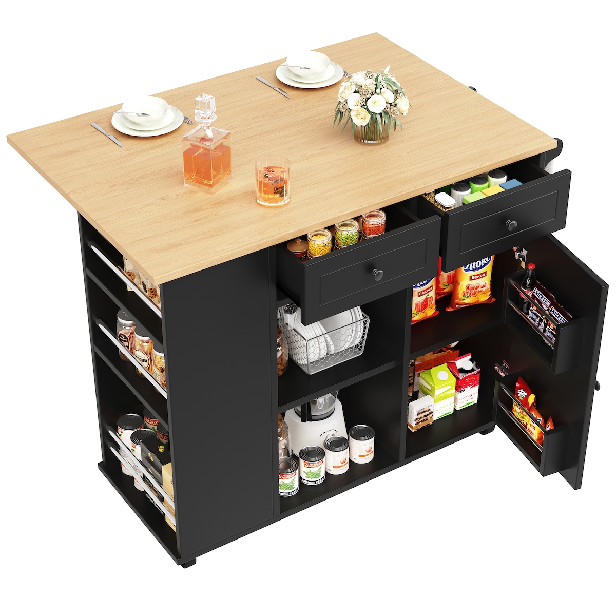 OKWISH Kücheninsel Küchenwagen Schwarz 122x74x92cm mit klappbarer Tischplatte, 8 Schubladen, Schrank,Gewürzregal, Handtuchhalter,Rollen mit Feststellfunktion