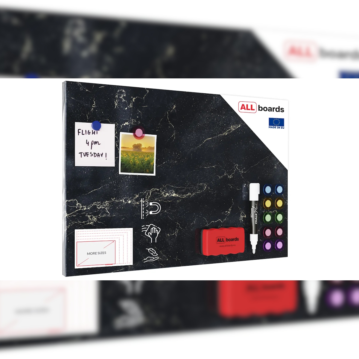 ALLboards Metallische Magnettafel SCHWARZER MARMOR 60x40cm Memoboard für jede Art von Magneten Magnetpinnwand + Marker, 10 Magnete und Schwamm
