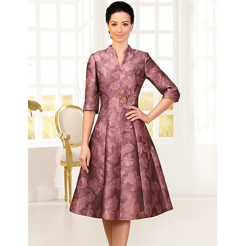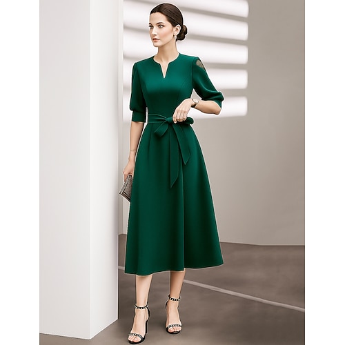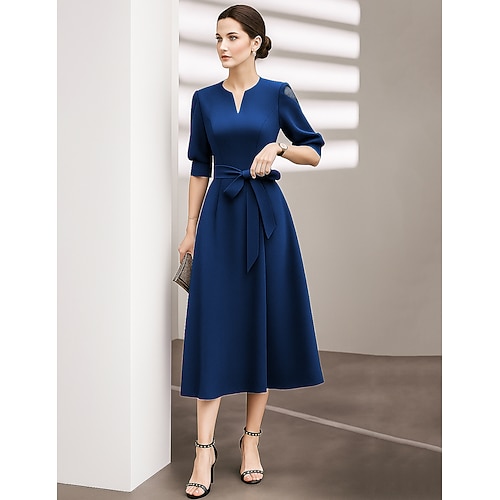 Abito da Festa A-Line di Lunghezza Tea Abito da Cocktail Abito per Ospiti di Nozze Abito per Madre della Sposa Mezza Manica Collo a V Elegante Vintage Festa con Pieghe