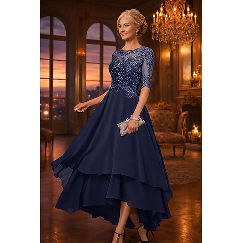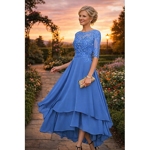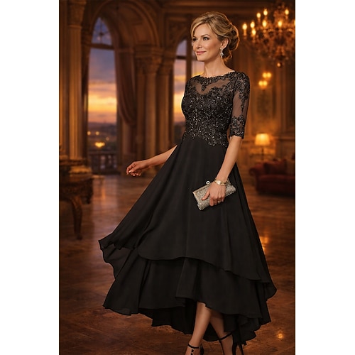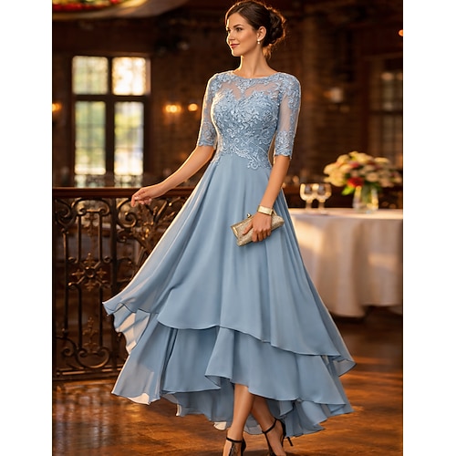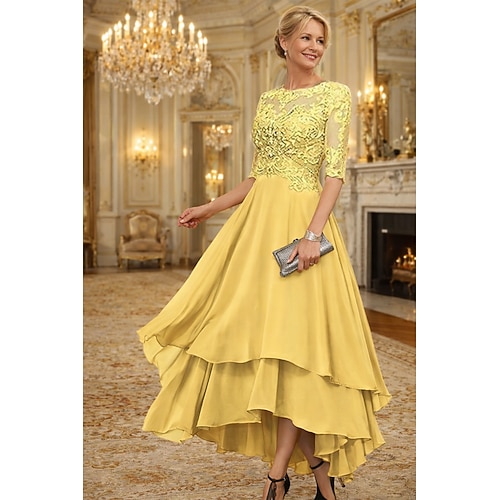 Abito da Festa A-Line Asimmetrico Abito da Cocktail Abito per Ospiti di Nozze Abito per Madre della Sposa Mezza Manica Collo Barchetta Elegante Semplice Formale Ospite di Nozze con Colore Solido