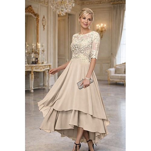 A-Line Abito da Sposa per Invitate Lunghezza Piena Abiti Formali Abito da Sera Abito Madre della Sposa Manica Corta Girocollo Elegante Vintage Festa Pizzo con Pizzo