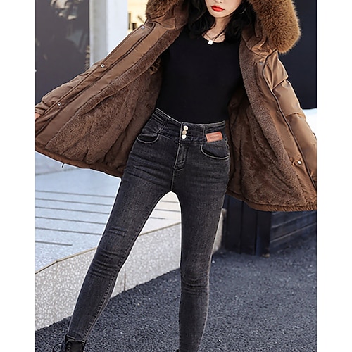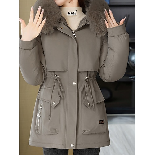 Damen Wintermantel Parka Warm Bequem Fellbesatz Reißverschluss Tasche Pelzkragen Lässig Einfach Outdoor Urlaub Alltagskleidung Ausgehen Lang Mit Kapuze Normale Passform Langarm Oberbekleidung