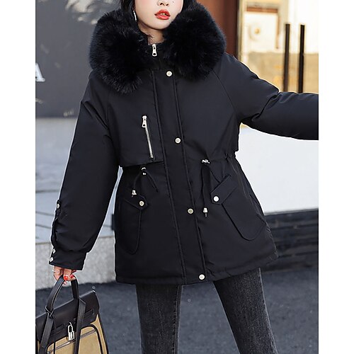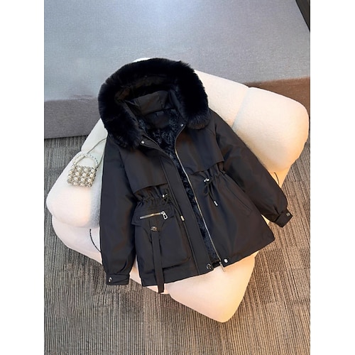 Damen Wintermantel Parka Warm Bequem Fellbesatz Reißverschluss Tasche Pelzkragen Lässig Einfach Urlaub Straße Lässig Alltagskleidung Regulär Mit Kapuze Normale Passform Langarm Oberbekleidung Schwarz