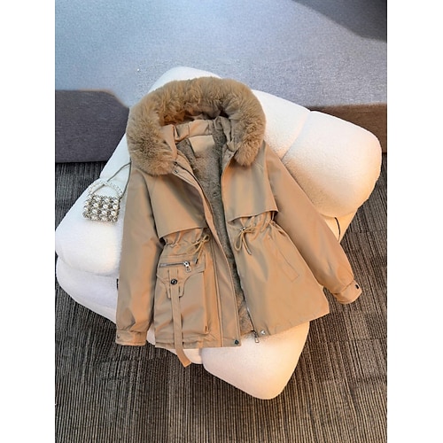 Damen Wintermantel Parka Warm Bequem Fellbesatz Reißverschluss Tasche Pelzkragen Lässig Einfach Urlaub Alltagskleidung Ausgehen Wochenende Regulär Mit Kapuze Normale Passform Langarm Oberbekleidung