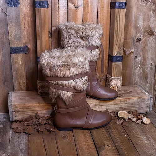 stivali medievali da uomo in similpelle marrone – fodera in pelliccia sintetica con elegante cinturino, ideali per rievocazioni storiche, cosplay e abbigliamento invernale