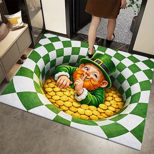 Tappeto con illusione ottica 3D per San Patrizio, zerbino con stampa piatta 2D raffigurante un allegro folletto con motivo a vortice a scacchi verdi e bianchi, perfetto per l'ingresso di casa in stile
