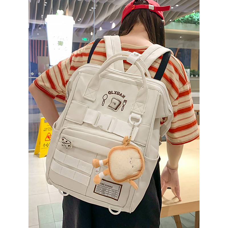 Waterproof Toast Cartoon Backpack for Girls – Kawaii School Bag with Plush Keychain and Multi-Pockets for Teenagers, College and Travel Black White Yellow