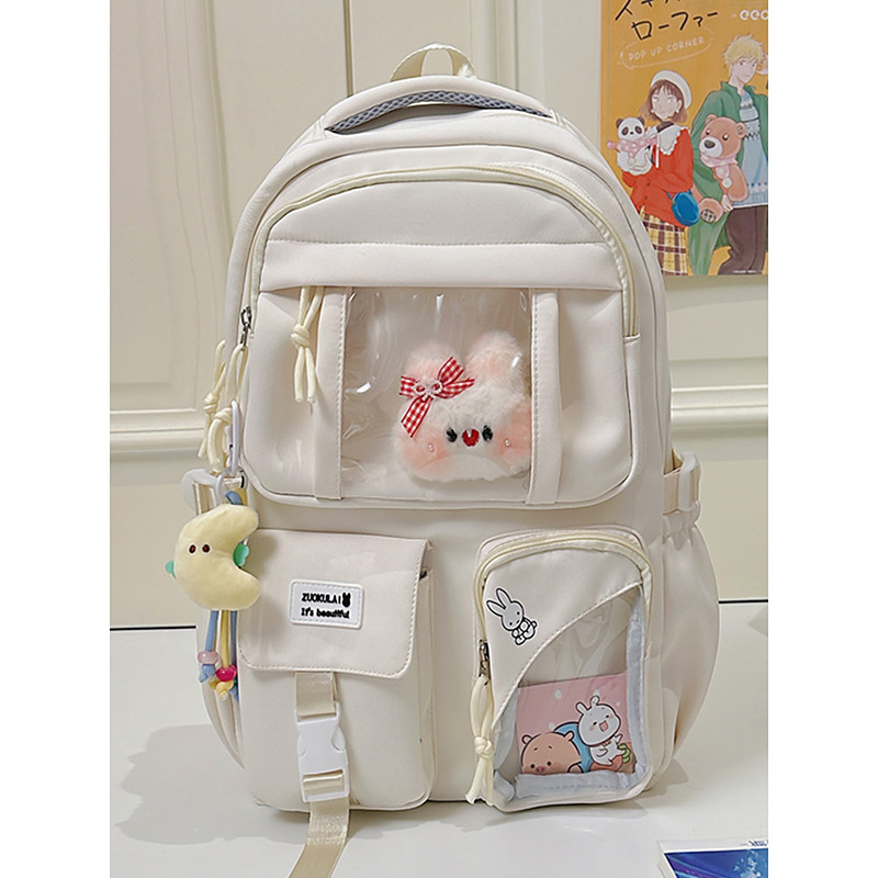 Women's 6-Piece Cute Kawaii Backpack Set with Clear Front Pockets, Cartoon Pins and Plush Charms, Lightweight Nylon School Bag for Teen Girls Campus Travel Daily Use