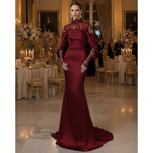 Sirena Tromba Lunghezza al pavimento Abito da Sera Abito formale Elegante Vintage Scintillante Manica Lunga Collo Alto Matrimonio Formale Tasca Raso Pizzo con Glitter Perle