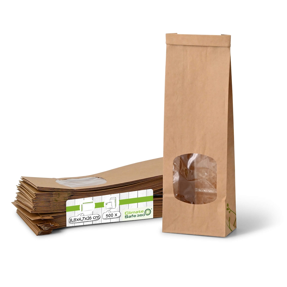greenbox - Blockbeutel m. Fenster S, 8,8 x 4,7 x 26 cm, PLA-Folie, braun, Clipband, Kraftpapier, 500 St.