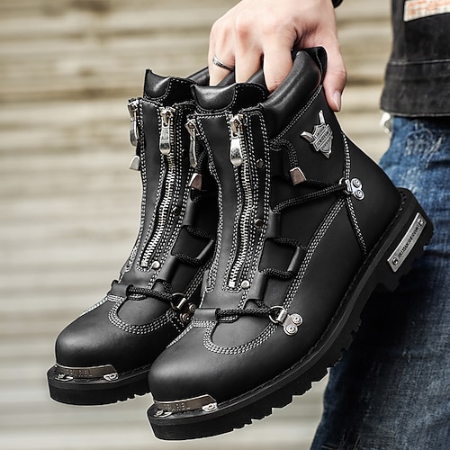 stivali da combattimento neri da uomo - stile motociclista con lacci punk gotico, catene e fibbie, calzature urbane streetwear per outfit da città