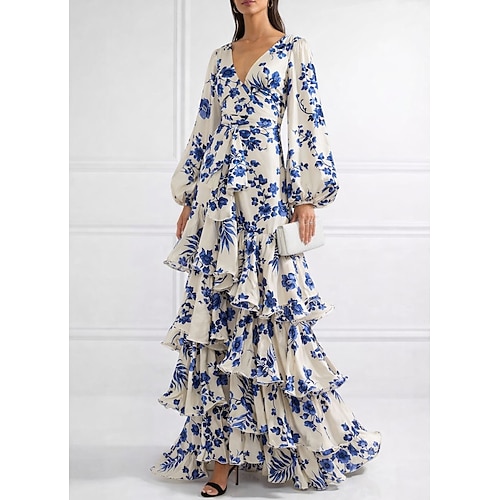 Linea ad A Lunghezza al pavimento Abito da Sera Elegante Floreale Manica Lunga Scollo a V Festa in giardino Matrimonio Raso con Stampa floreale Volant