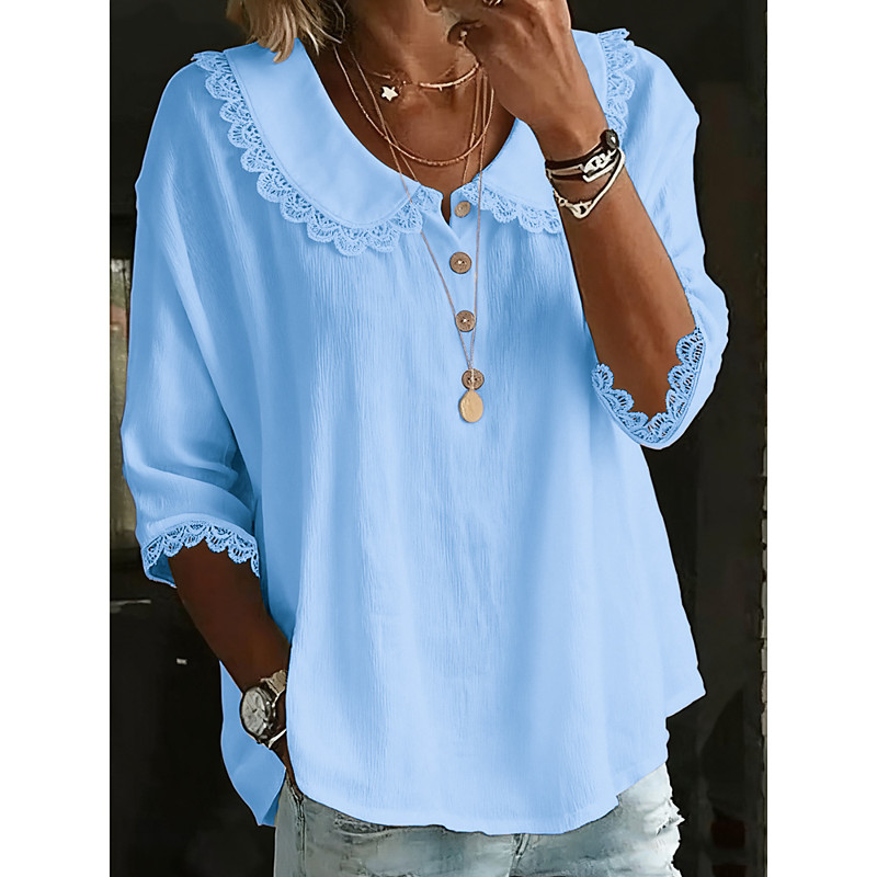 Women's Blouse Solid Color Stylish Casual 3/4 Length Sleeve Shirt Collar Regular Tops Daily Lace Trim Blue White Yellow Pink Summer Spring Fall