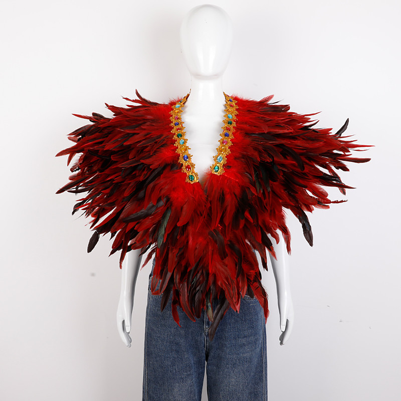 Women's Mardi Gras Feather Cape Shawl, Purple Green Gold Feather Poncho with Jeweled Collar, Carnival Parade Costume Accessories