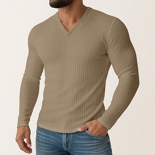 Herren Slim Fit Geripptes Langarmhemd mit V-Ausschnitt Tailliertes Casual Strick Muscle Tee Top Frühling Herbst Winter Einfarbig Pit Strip Mode Designer Basic Stricken Urlaub Street Casual Schwarz Weiß Lila T-Shirt