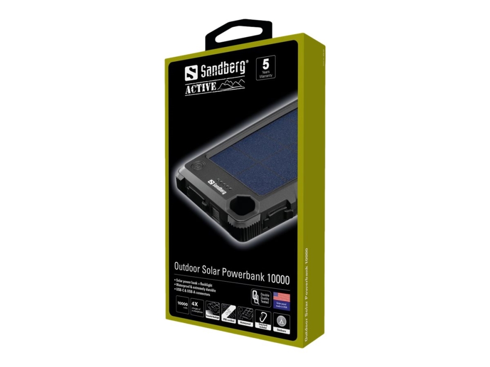 Sandberg Outdoor Solar Powerbank 10000 - Solenergibank - 10000 mAh - 37 Wh - 3 A (USB, USB-C) - på kabel: Micro-USB, USB-C