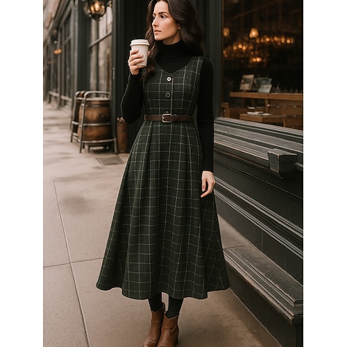 Per donna Abito Midi Tubino Abito a trapezio Vacanza Casual Boho Quotidiano Ferie Plaid Manica Lunga Dolcevita Verde scuro blu navy Marrone