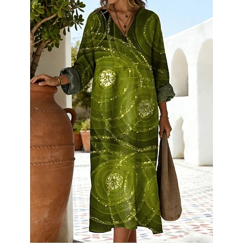 Per donna Abito Midi Vestito Estivo Vacanza Casual Spiaggia Vestibilità regolare Floreale Grafico Manica Lunga Scollo a V Marrone Verde Estate Primavera