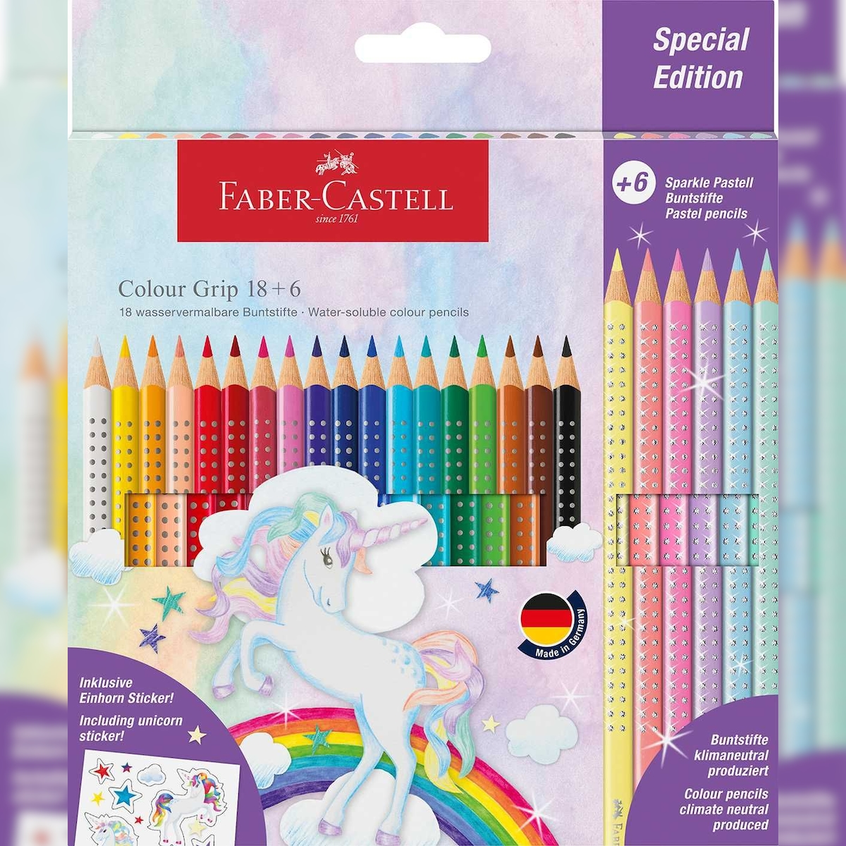 FABER-CASTELL 201543 Buntstifte Colour GRIP Einhorn - 18+6 Farben, Kartonetui inkl. Aufkleber