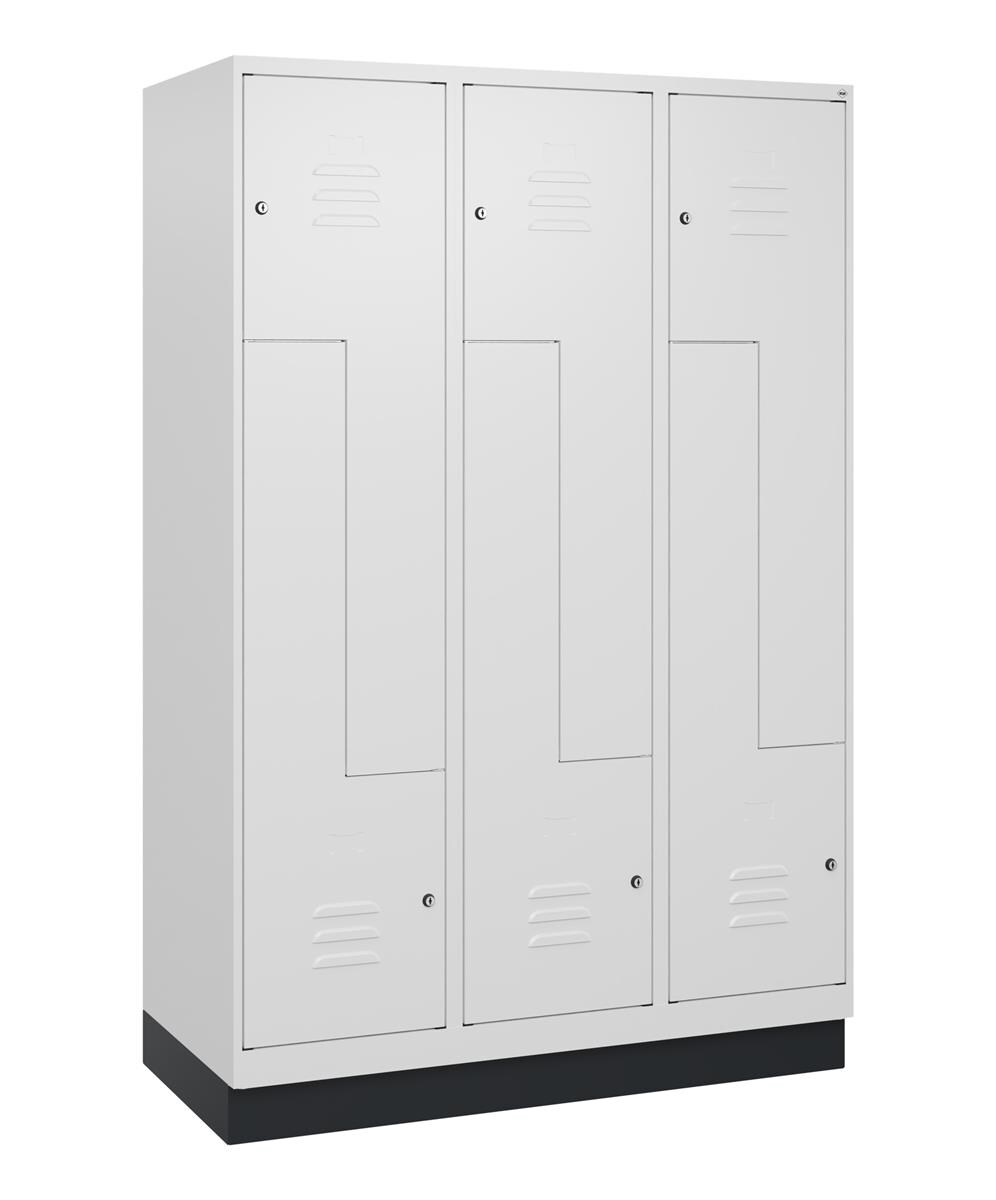Spind Classic PLUS, 3 Abteile, grau, B 900 mm, mit Bodensockel, Drehriegel C+P