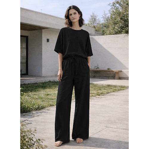 15% lino set da donna in lino misto lino set due pezzi basic colore puro tasca elastico in vita maglietta pantaloni strada quotidiano manica lunga girocollo nero bianco blu navy marrone chiaro blu estate primavera