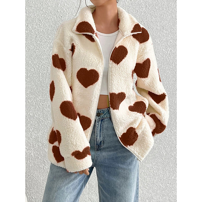 Women's Winter Coat Winter Jacket Comfortable Breathable Zipper Pocket Print Casual Heart Vacation Street Casual Daily Wear Zipper Regular Turndown Loose Fit Long Sleeve Outerwear Black Red Fuchsia