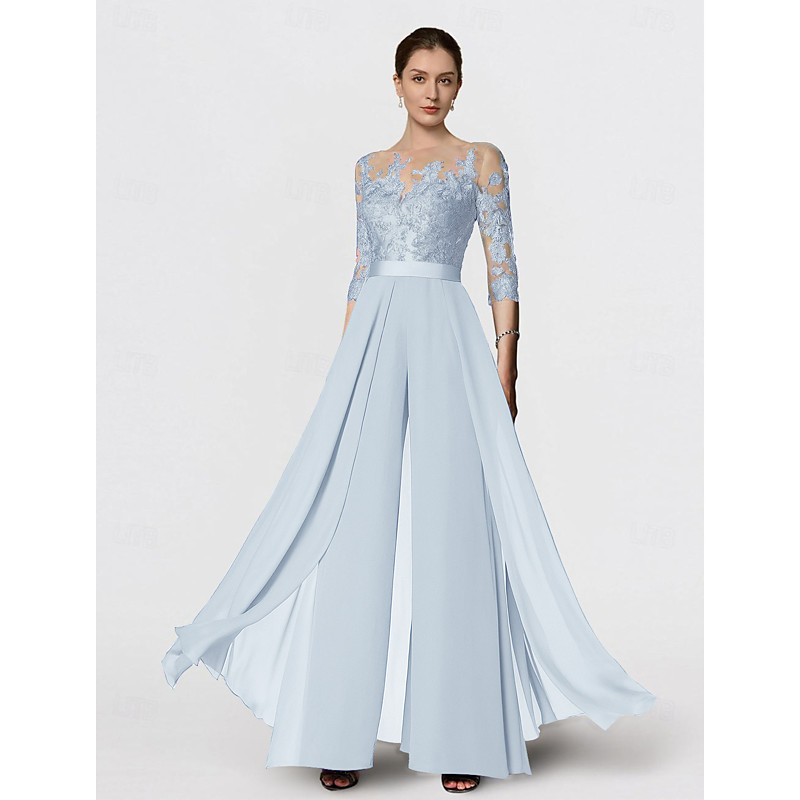 Jumpsuit Pantsuit Ankle Length Mother of the Bride Dress 3/4 Length Sleeve Scoop Neck Elegant Party Formal Wedding Guest Chiffon Lace with Appliques