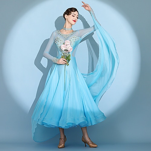 vestito da ballo salsa latino con cristalli/strass allenamento da donna a maniche lunghe in tulle alto spandex