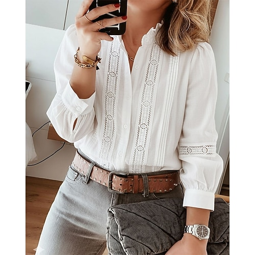 Per donna Camicia Blusa Semplice Elegante Vintage Quotidiano Manica Lunga Collo Alto Top Regolari Quotidiano Lavoro Ferie Arricciato Patchwork Traforato Bianco Autunno Inverno