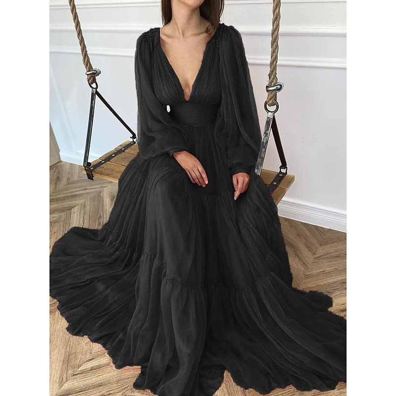 A-Line Floor Length Prom Dresses Evening Gown Ball Gown Formal Dress Elegant Princess Long Sleeve V Neck Prom Formal Chiffon with Ruched