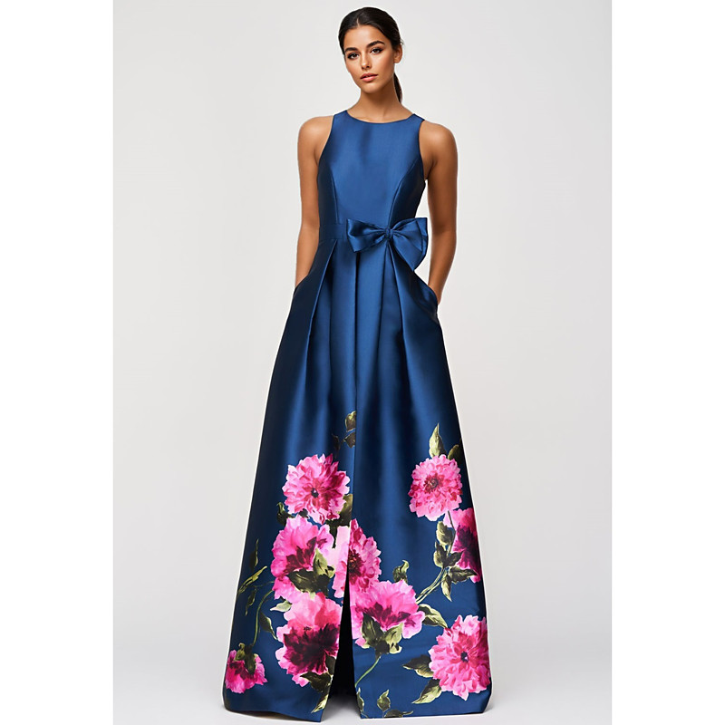A-Line Floor Length Evening Gown Ball Gown Formal Dress Elegant Vintage Sleeveless High Neck Wedding Formal Pocket Satin with Floral Print