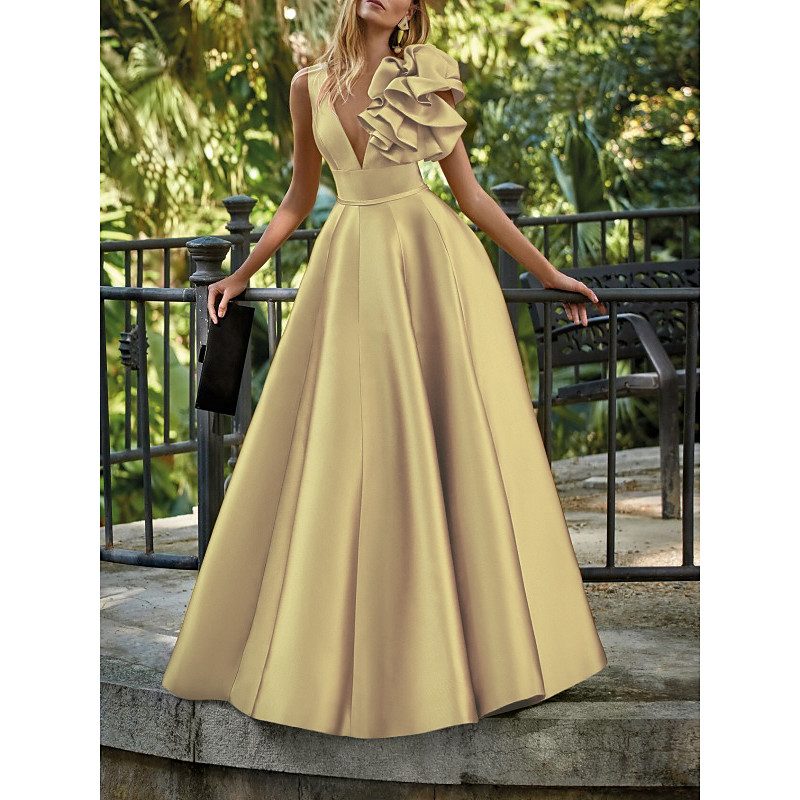 A-Line Floor Length Prom Dresses Evening Gown Ball Gown Formal Dress Elegant Party Sleeveless V Neck Formal Wedding Guest Satin with Shouder Flower