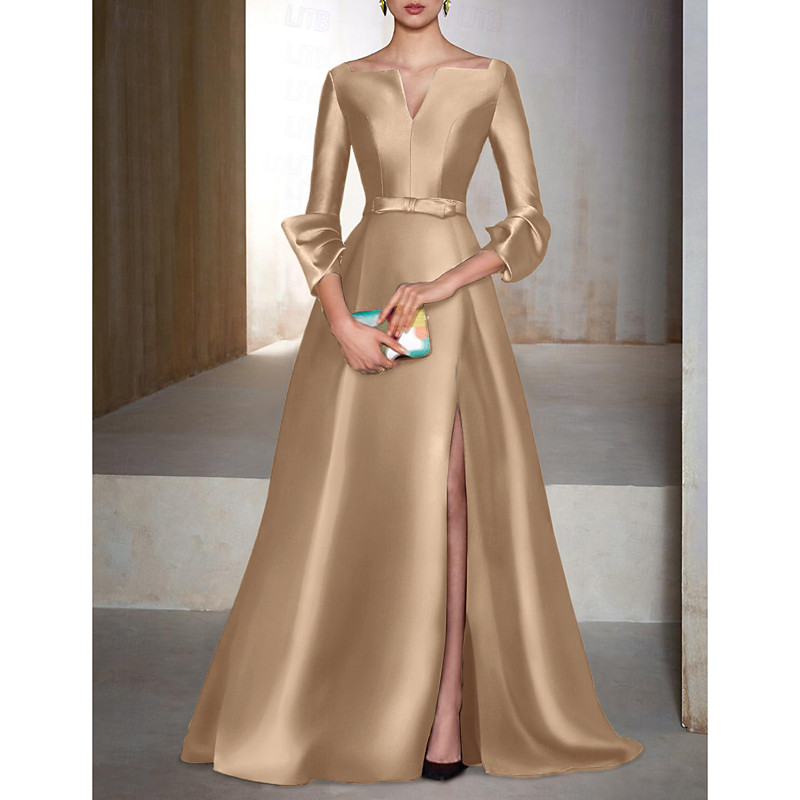 A-Line Floor Length Evening Gown Ball Gown Formal Dress Elegant Silky 3/4 Length Sleeve V Neck Wedding Guest Cocktail Party Satin with Slit