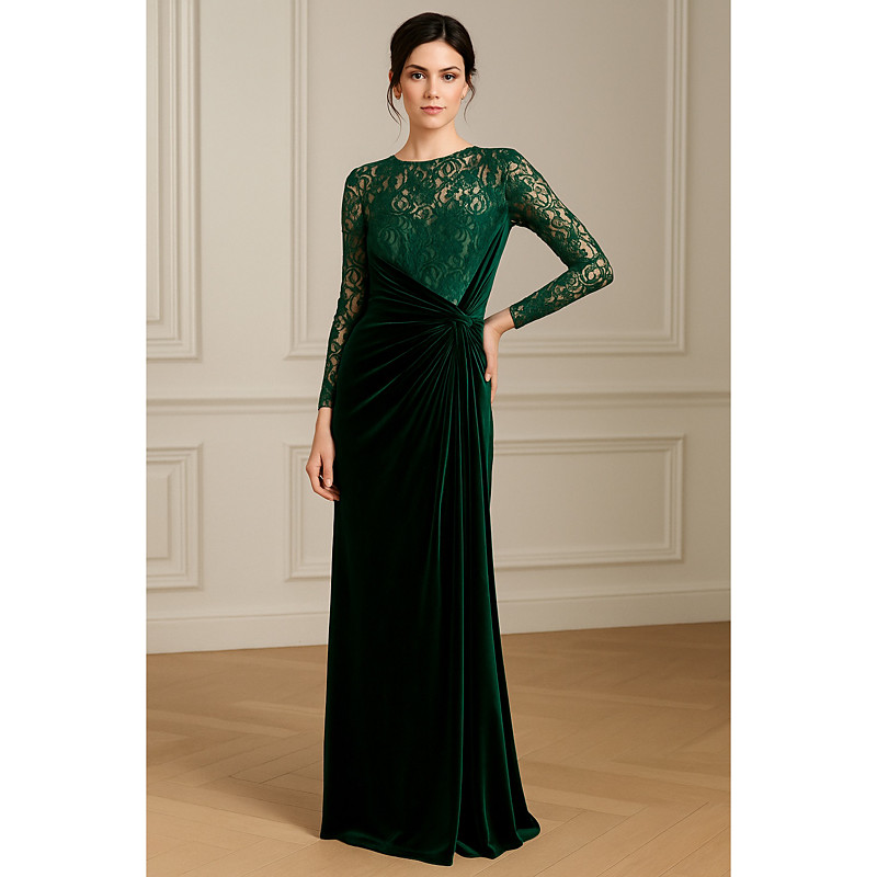 Sheath Column Floor Length Prom Dresses Evening Gown Ball Gown Formal Dress Elegant Black Dress Silky Long Sleeve Illusion Neck Wedding Formal Lace Velvet with Pleats