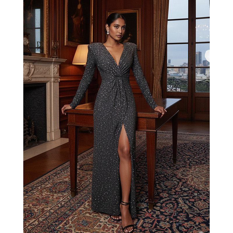 Sheath Column Floor Length Prom Dresses Evening Gown Ball Gown Formal Dress Elegant Glittering Celebrity Style Long Sleeve V Neck Garden Party Wedding Stretch Crepe with Slit