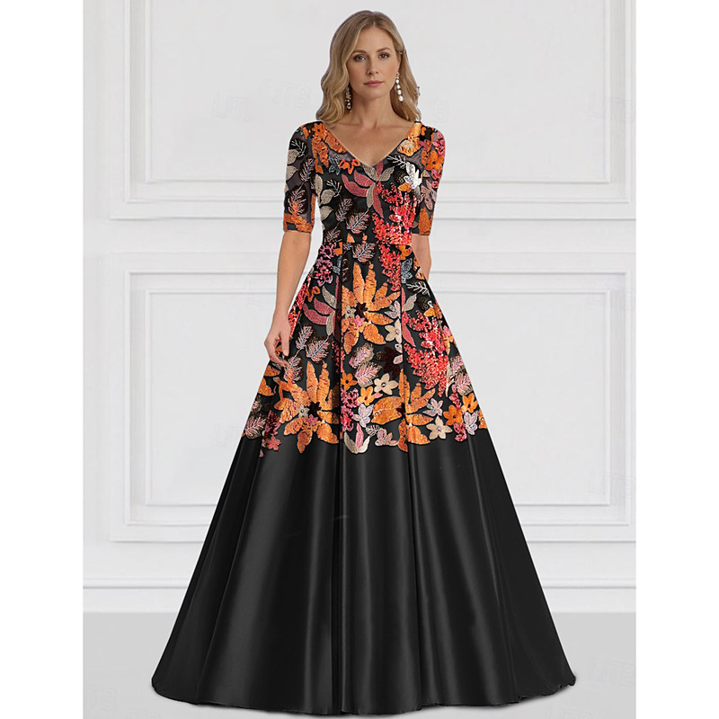 A-Line Floor Length Beaded Eembroidered Formal Dresses Mother of the Bride Dress Evening Gown Ball Gown Formal Dress Elegant Vintage Glittering Half Sleeve V Neck Wedding Formal Satin Sequined with