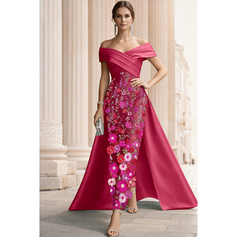 A-Line Floor Length Beaded Eembroidered Formal Dresses Mother of the Bride Dress Evening Gown Ball Gown with Overskirt Formal Dress Elegant High Split Short Sleeve Off Shoulder Wedding Formal Satin