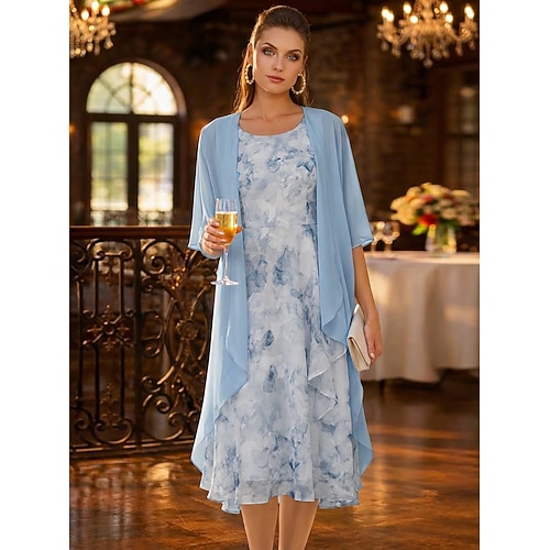 Due Pezzi Linea ad A Lunghezza Tè Abito da invitata a nozze Abito da cerimonia per signora Senza Maniche Manica 3/4 Girocollo Elegante Semplice Minimalista Formale Semi-Formale Chiffon Jacquard con