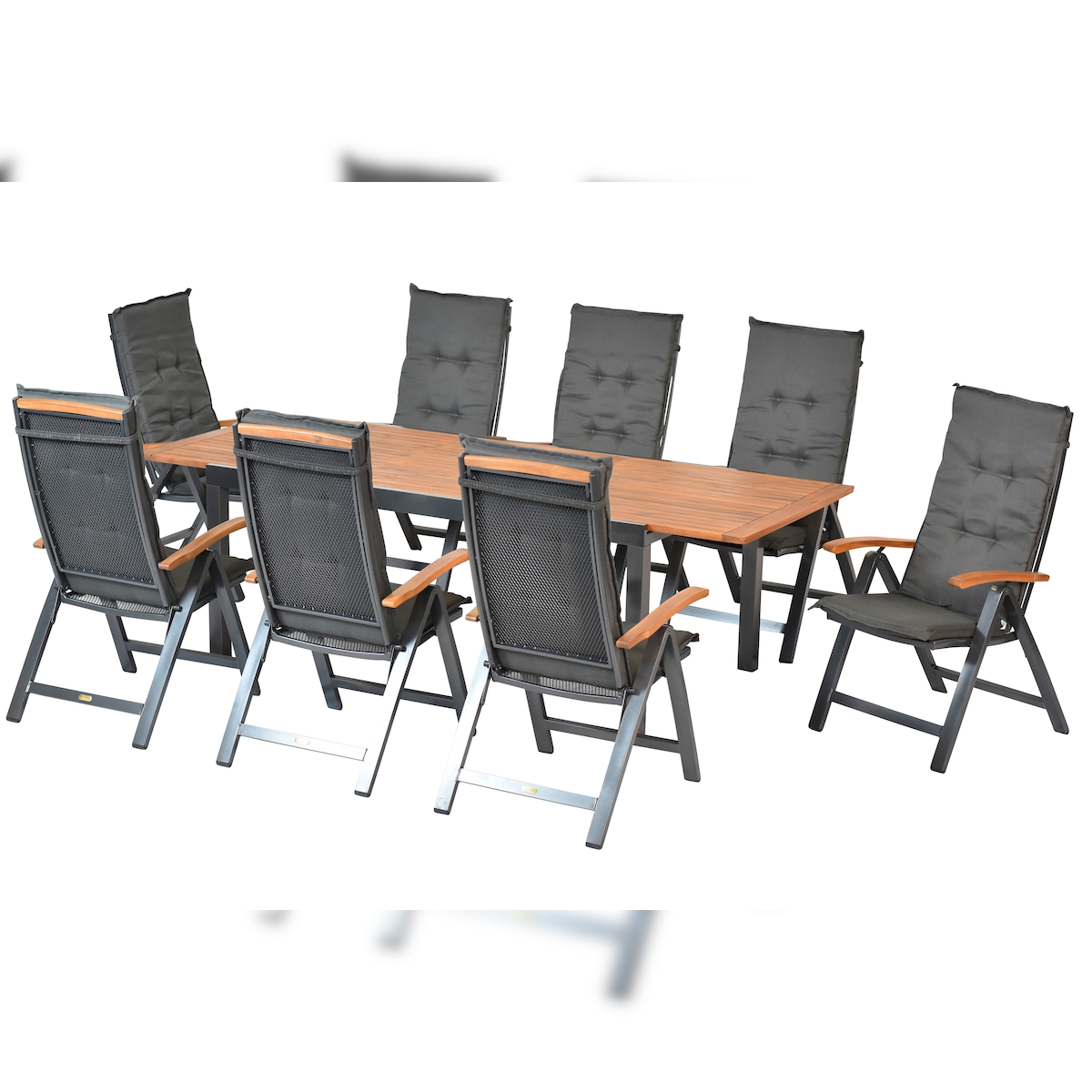 Merxx Tilos Set 17tlg., 8 Klappsessel, 8 Auflegepolster, 1 Tisch 180(250) x 100 cm, Aluminium