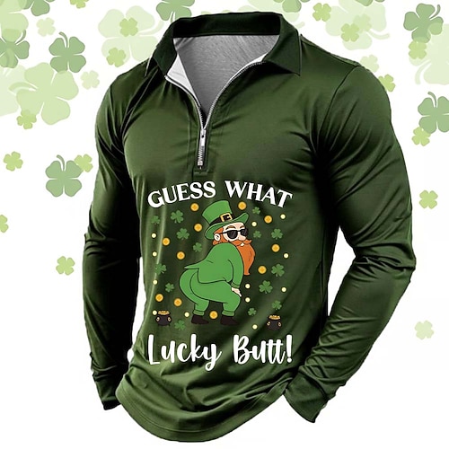 Giorno di San Patrizio Per uomo Trifoglio Elfo di Natale Polo con zip Manica Lunga Magliette polo Bavero Casual All'aperto Abito da festa Stampa 3D Primavera Autunno Nero Verde chiaro Verde