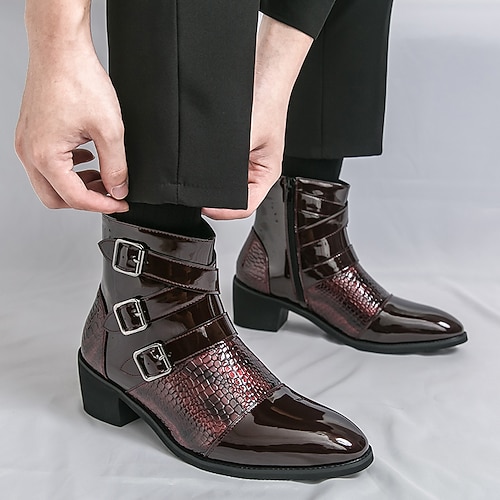stivali da uomo in similpelle verniciata bordeaux con tripla fibbia e texture coccodrillo - calzature alla moda per abiti da sera, feste e occasioni speciali
